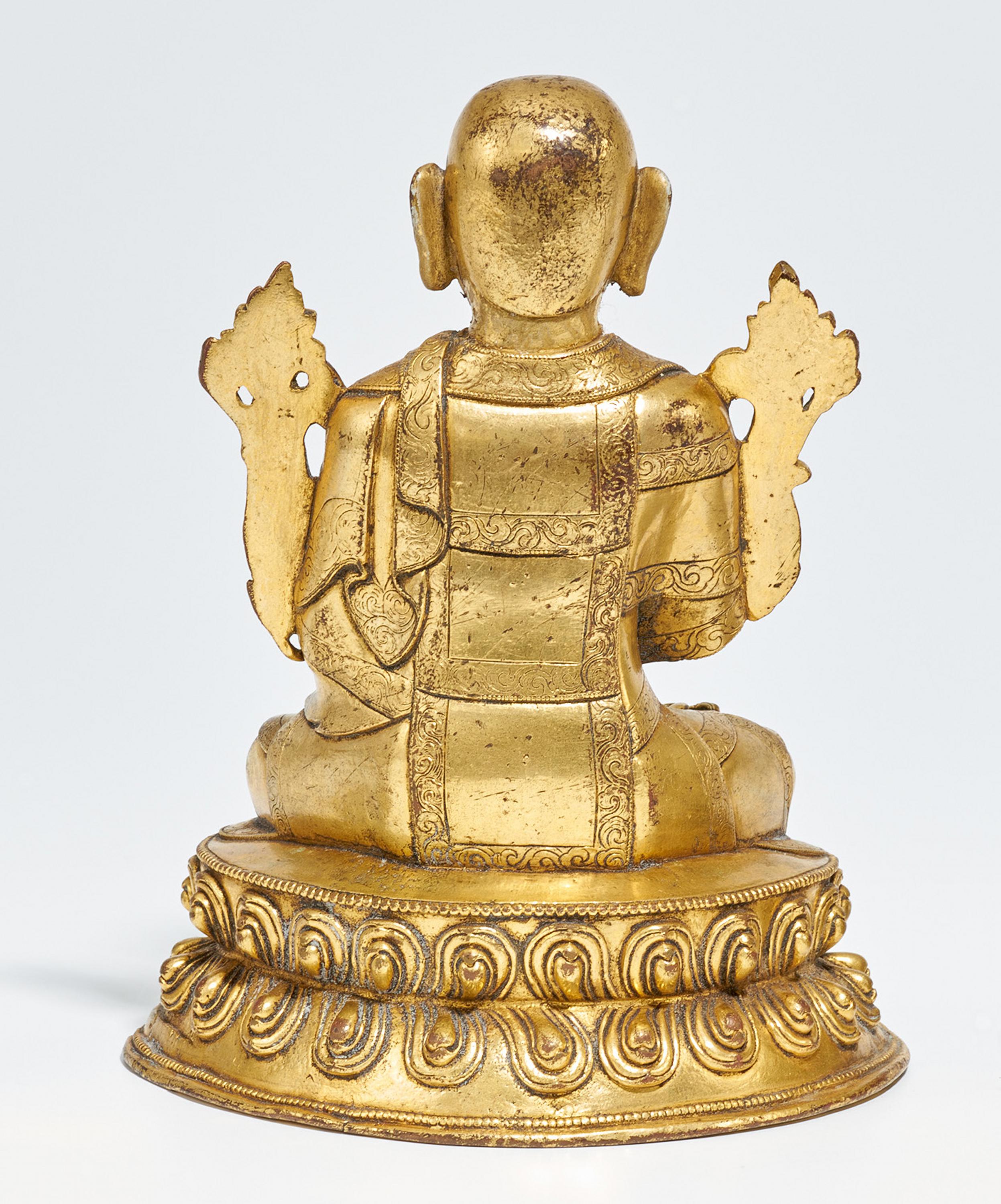 wohl ein Buch, Symbole des Manjushri. Die Gewänder sind mit fein gravierten Borten