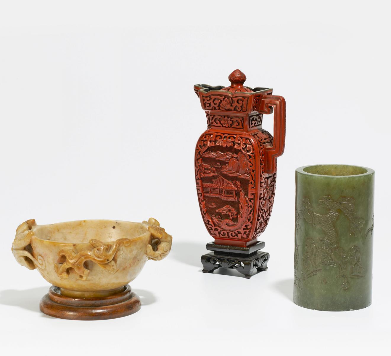 Zustand A/B. Beilage: Sengmaohu-Kanne mit Deckel. China. 19./20. Jh. Bronze mit rotem Schnitzlack, innen schwarz lackiert. H.19cm. Zustand A/B.