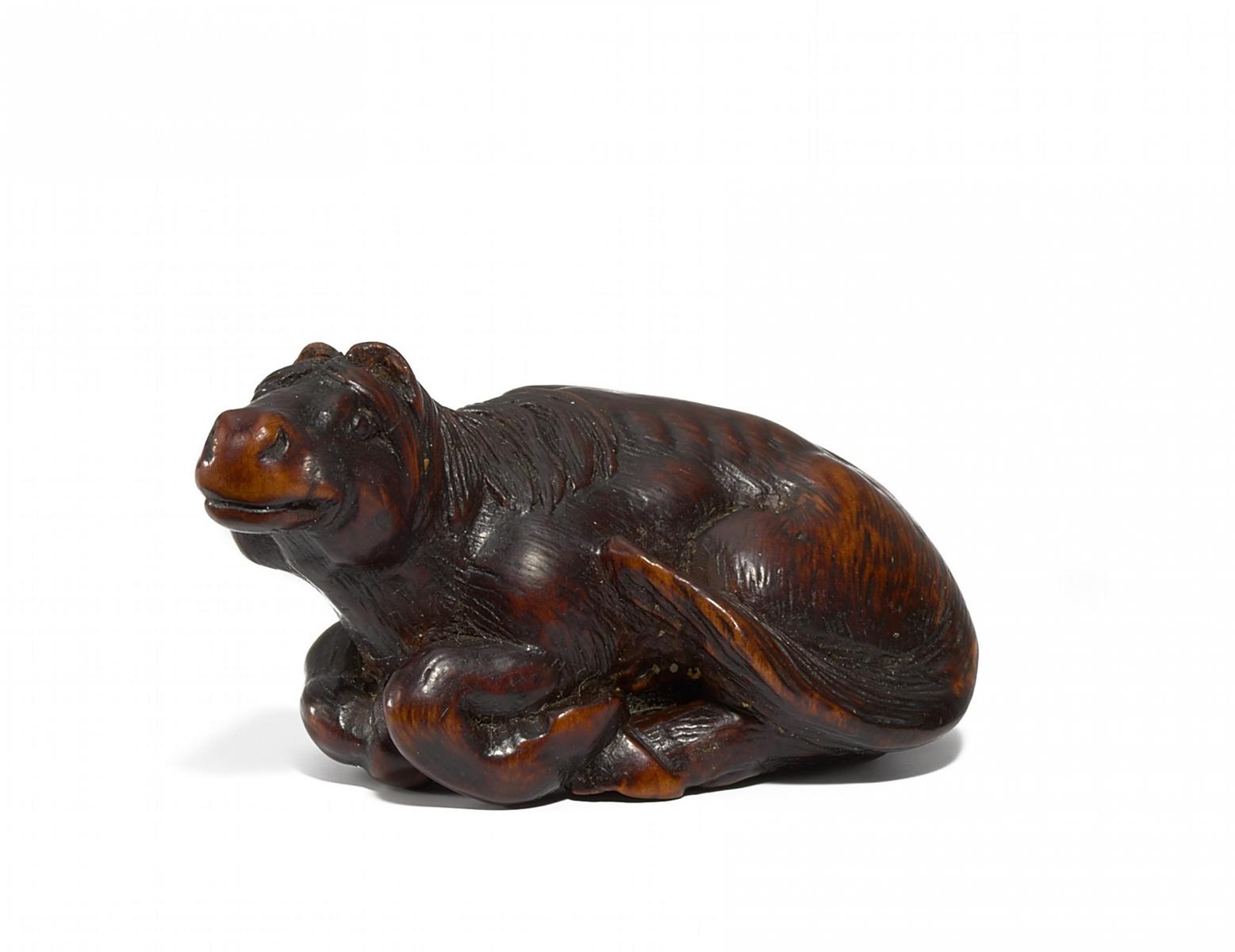 Beschreibung: Das Tier mit leicht vorgerecktem Kopf und zotteliger Mähne ist subtil geschnitzt und