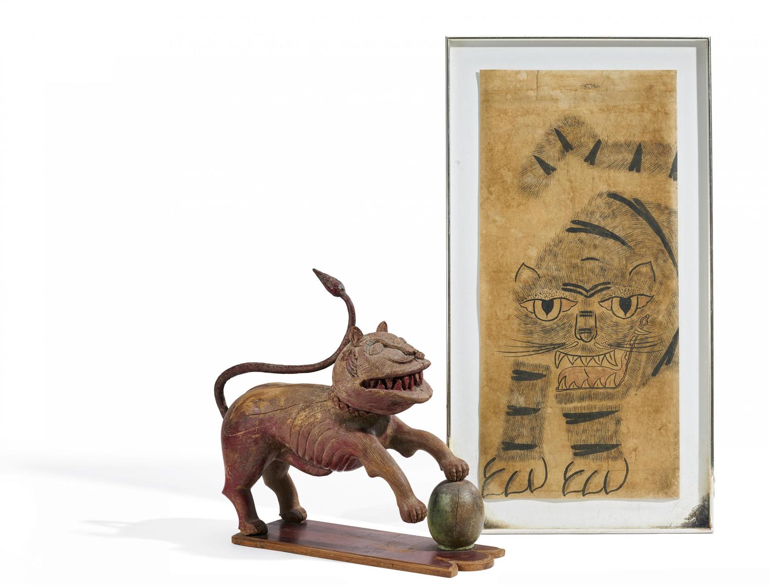 Zustand A/B. Beilage: Tiger. Tusche auf Papier. 90 x 42cm. Korea, 19./20. Jh. Hinter Glas gerahmt. Zustand B.