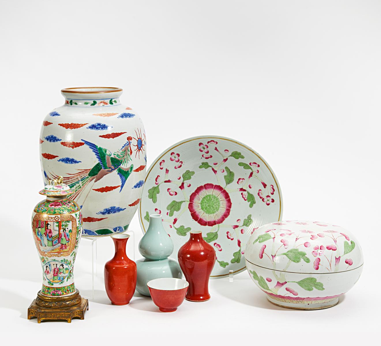 famille rose. Westliche Bronzemontierung. H.32cm. Paar Deckeldosen mit Begonien. H.17,5cm,