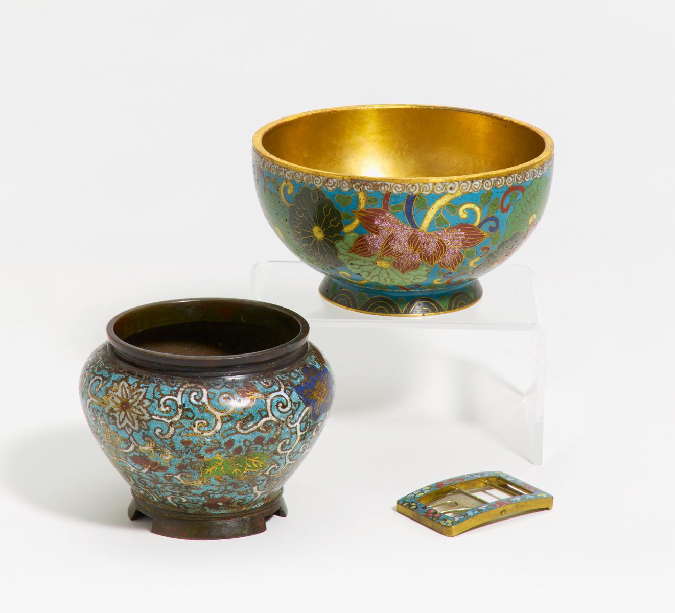 Zustand A/B. Beilage: Gürtelschnalle. Cloisonné. China. 6,5 x 4,3cm. Zustand A/B.