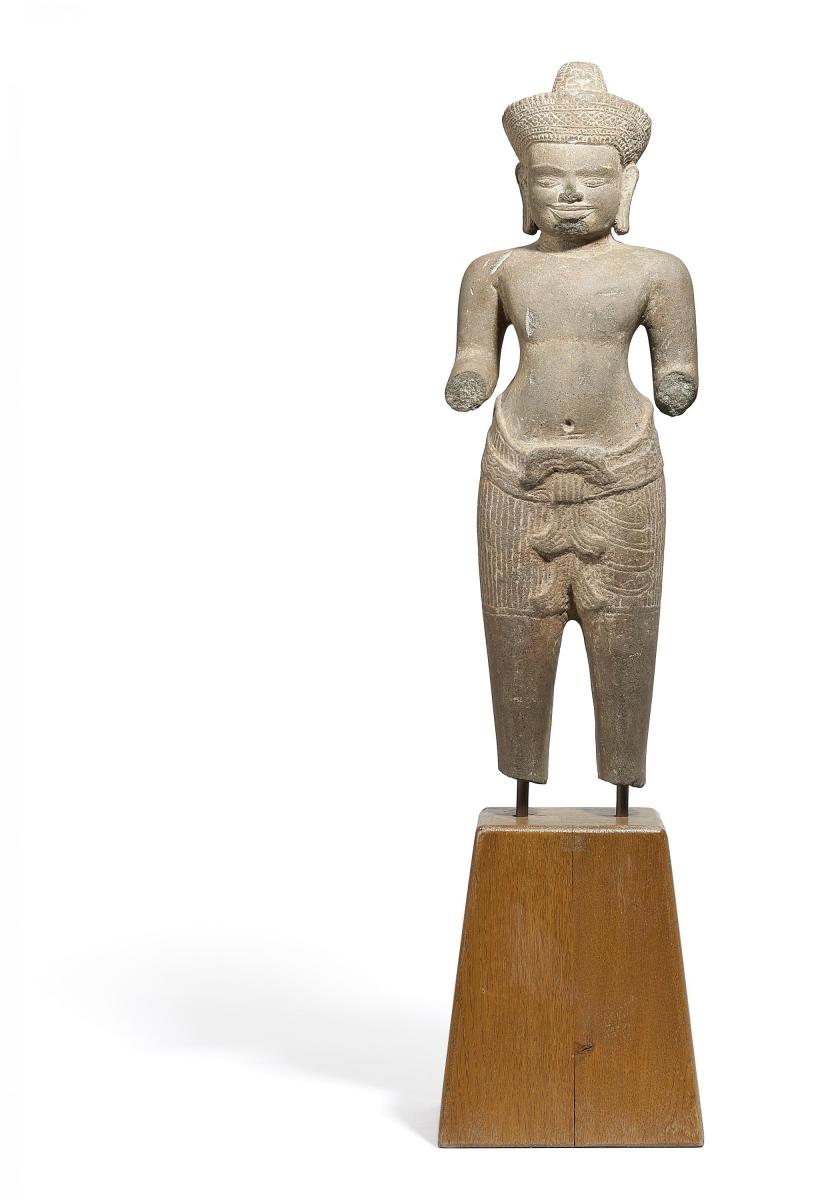 Beschreibung: Stehend, bekrönt und bekleidet mit einem fein gefältelten sampot, der vorne sog.