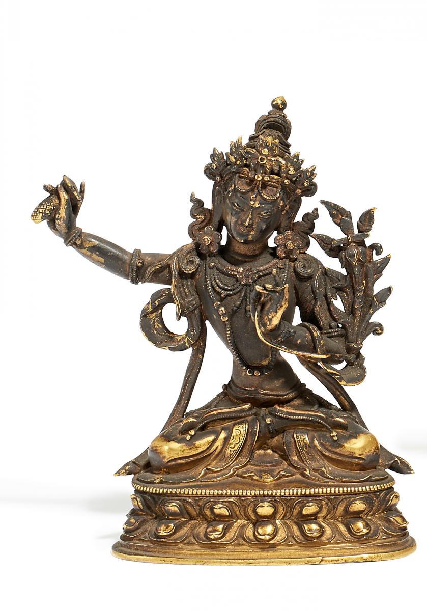 Beschreibung: Detailreich gestaltete Darstellung des Manjushri (tib. Jamyang) mit reichem Schmuck. In