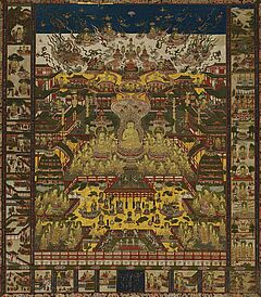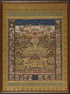 Beschreibung: Amida Nyorai im westlichen Paradies, flankiert von Kannon, Seishi und 39 weiteren