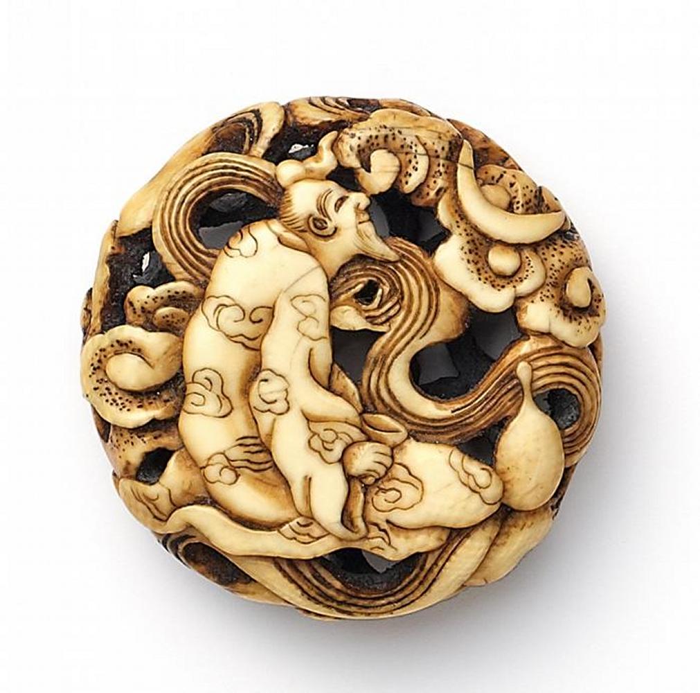 Hals auf dem Boden. Sehr fein geschnitzt und graviert, die Details dunkel akzentuiert. Die