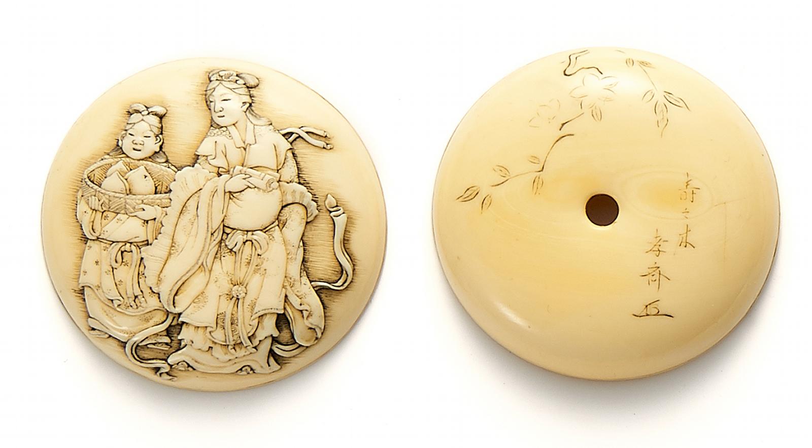 Signatur: Suzuki Kosai & Kakihan, vgl. MCI S. 390, der ein stilistisch ähnliches Manjû abbildet, zudem mit sehr abweichende Kakihan.