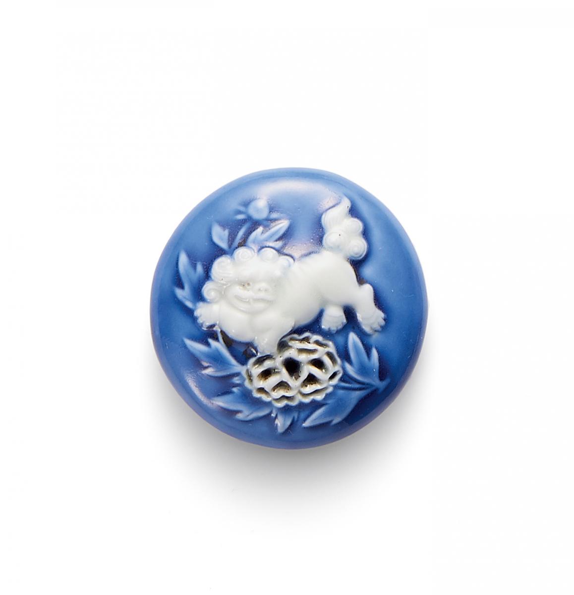 Beschreibung: Einteilig, rund. Auf der leicht gewölbten Oberseite, geschmückt mit einem blühenden Päonien-Zweig, die Blüte teils durchbrochen gearbeitet, über den ein Shishi mit Lockenkranz und wehendem Schwanz springt