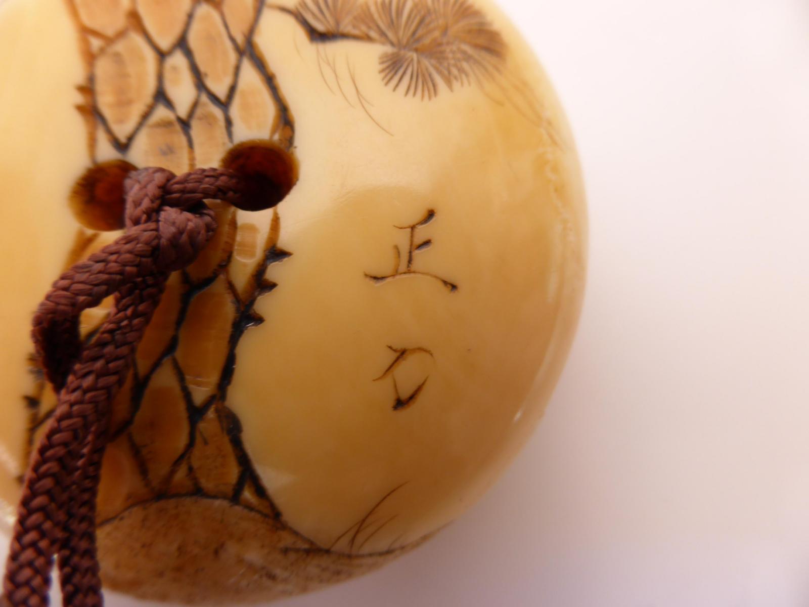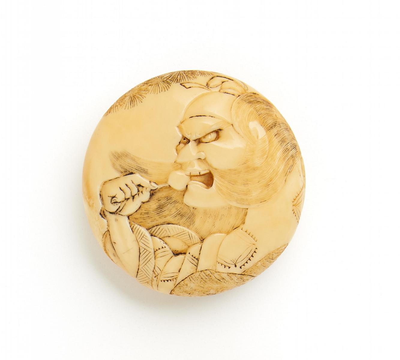 Beschreibung: Rund, einteilig. Brustbild des Shôki mit Mochi in der Hand unter einer großen Kiefer,