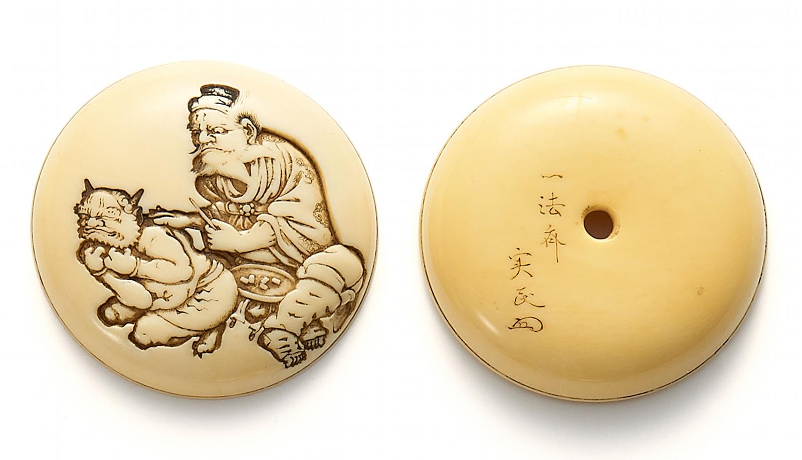 akzentuierten Relief Shôki mit Räucherstäbchen in der Linken, einem vor ihm hockenden Oni