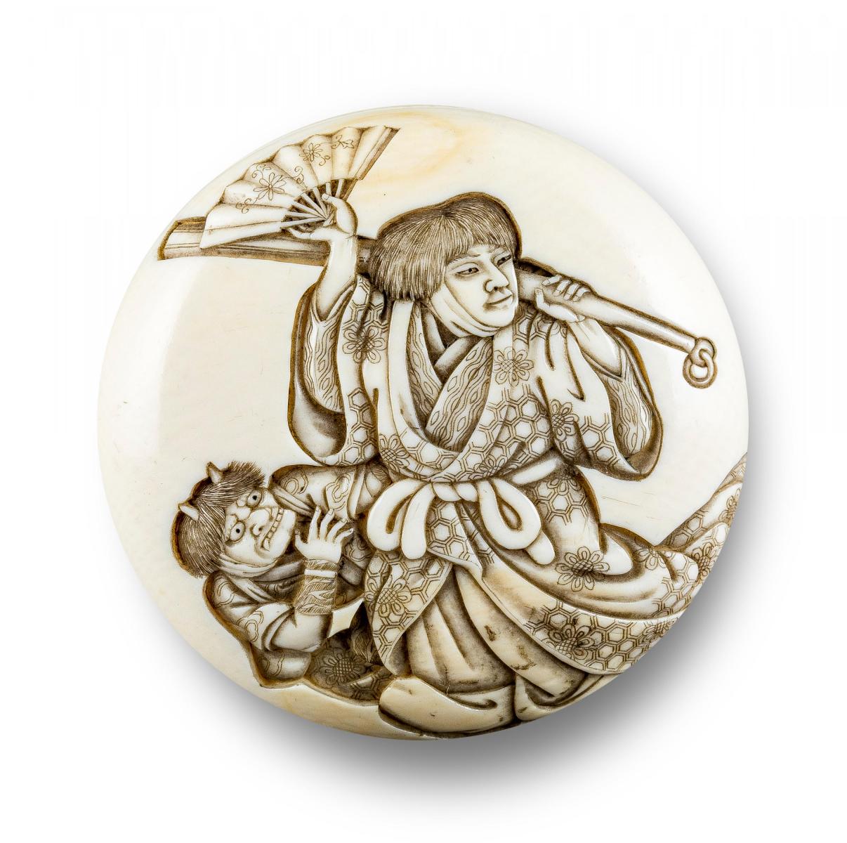 Beschreibung: Rund, zweiteilig. In versenktem Relief der sog. "Oba ga sake" (Der Wein der Tante) Kyôgen