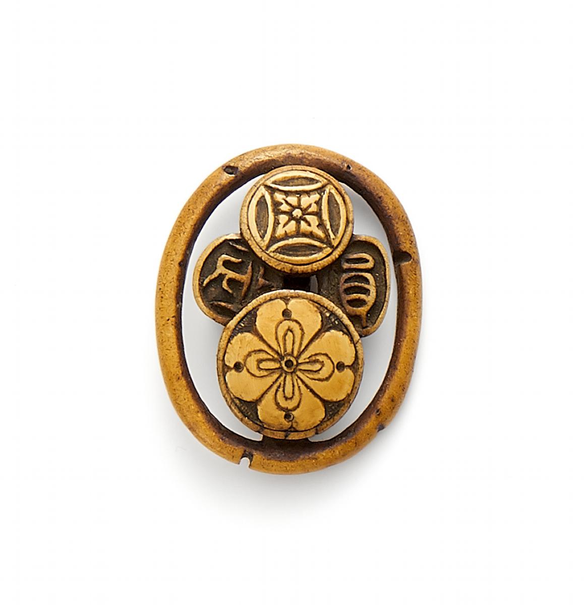Beschreibung: In einem ovalen Ring mit kräftigem Mittelbalken zwei runde Wappenformen mit stilisierten