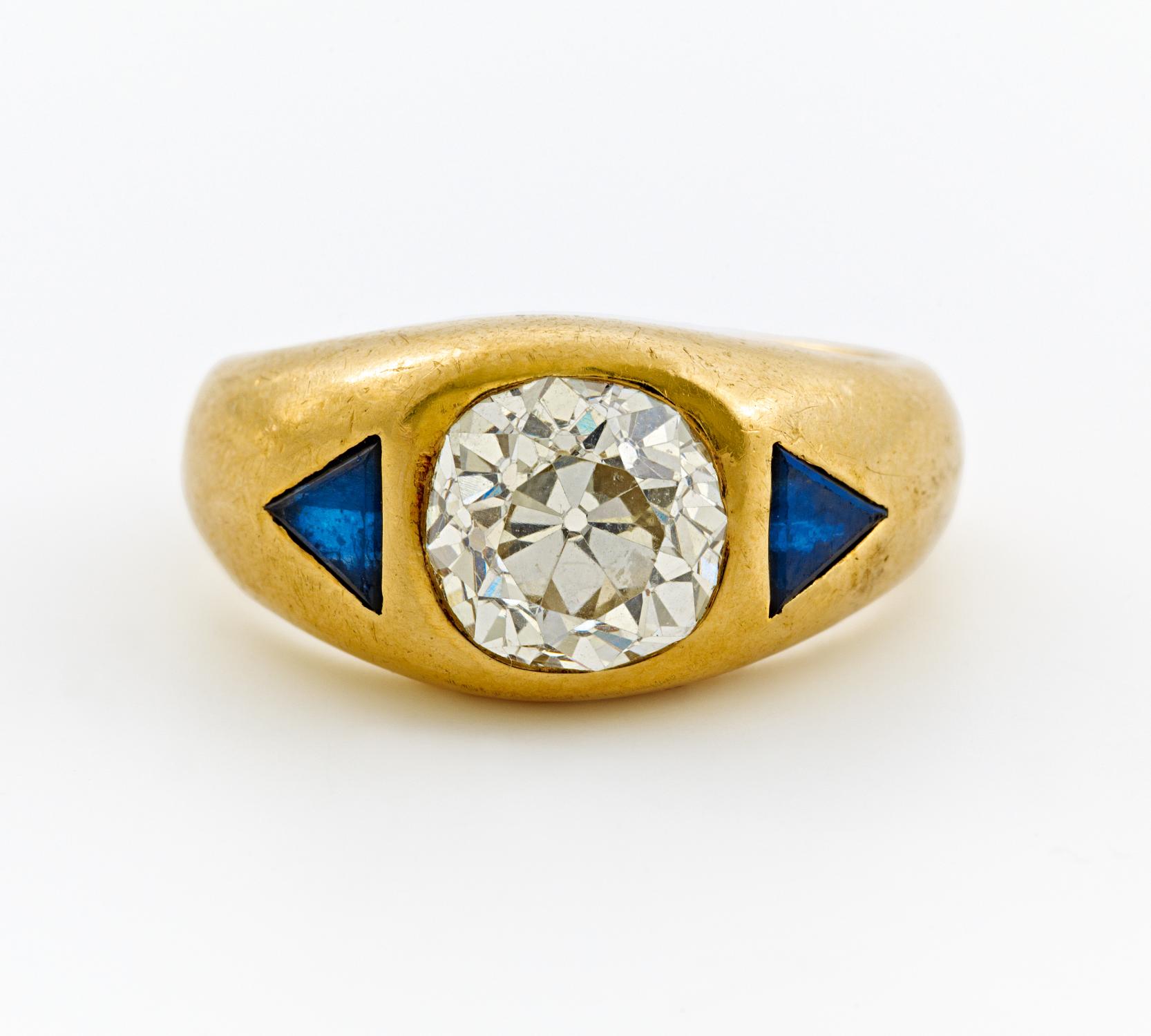750/- Gelbgold, Gewicht: 13,2g. 2 winzige, synthetische Saphir-Triangeln, 1 Altschliff-Diamant ca. 2,414ct Cape(M) VS2, EU-RM: 53. Eine obere Facettenkante mit Abplatzung.