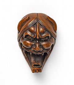 MASKEN-NETSUKE: HANNYA MIT WEIT GEÖFFNETEM MAUL.