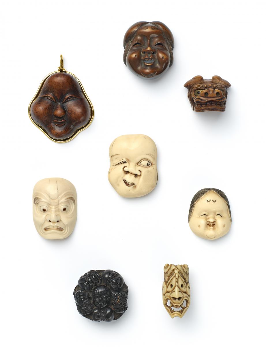 MASKEN-NETSUKE: OKAME, PILZE AUF DER RÜCKSEITE. BUCHSBAUM MIT GOLDMONTIERUNG.