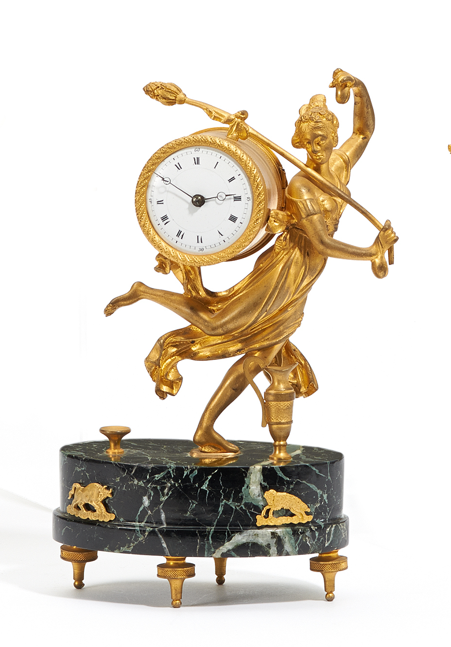 Grüner Marmor, Bronze vergoldet. Die bewegte Figur der Bacchantin das Uhrwerk tragend. Zifferblatt mit römischen Ziffern