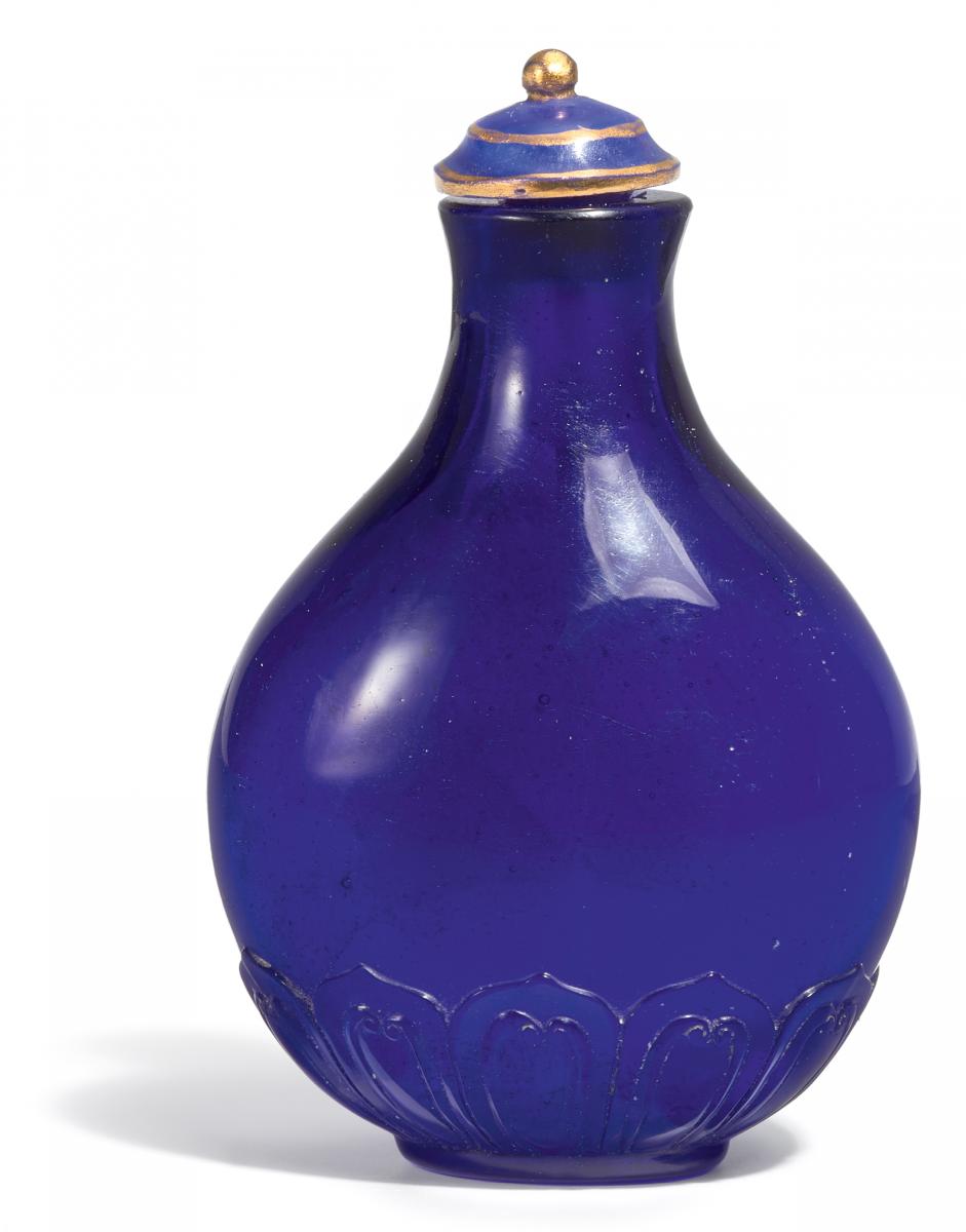 Lotosblättern um den Fuß. Der Farbton des Glases kräftig und klar. Blauer opaker