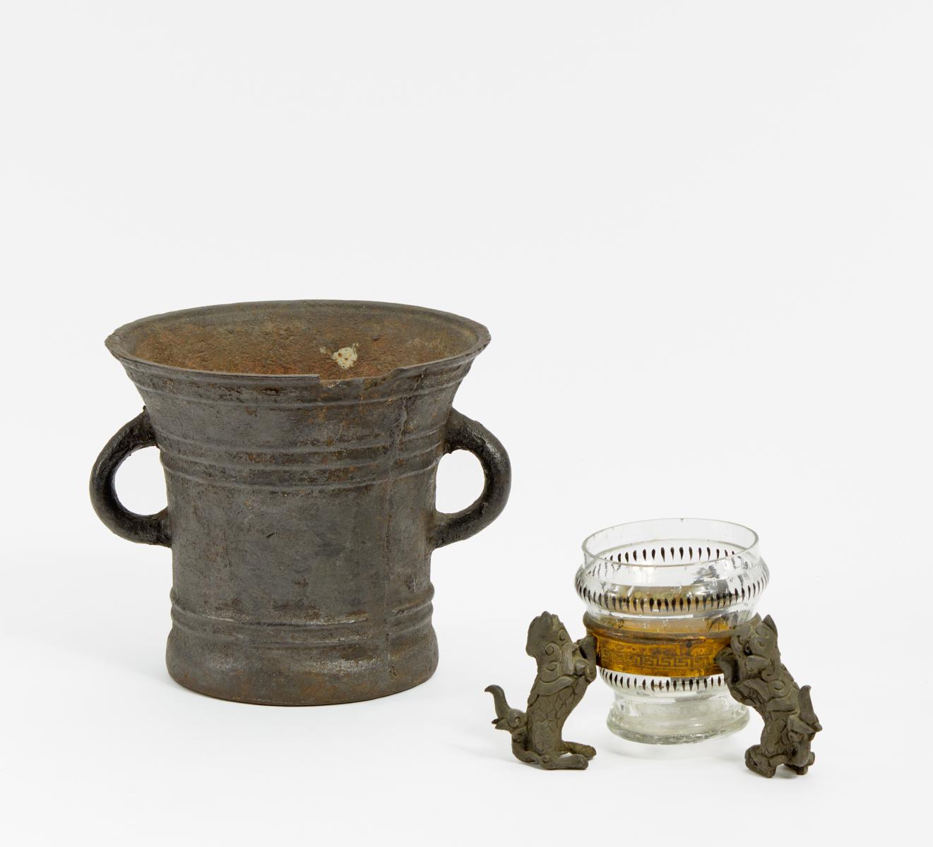 Zustand C. Beilage: Kleines Ziergefäß mit Löwen und Glaseinsatz.