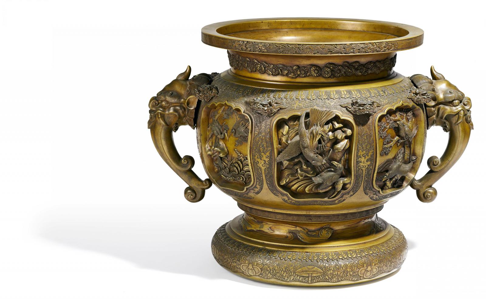 flachem Relief. Auf der Schulter acht Löwenköpfe, seitlich jeweils ein baku als Handhabe.