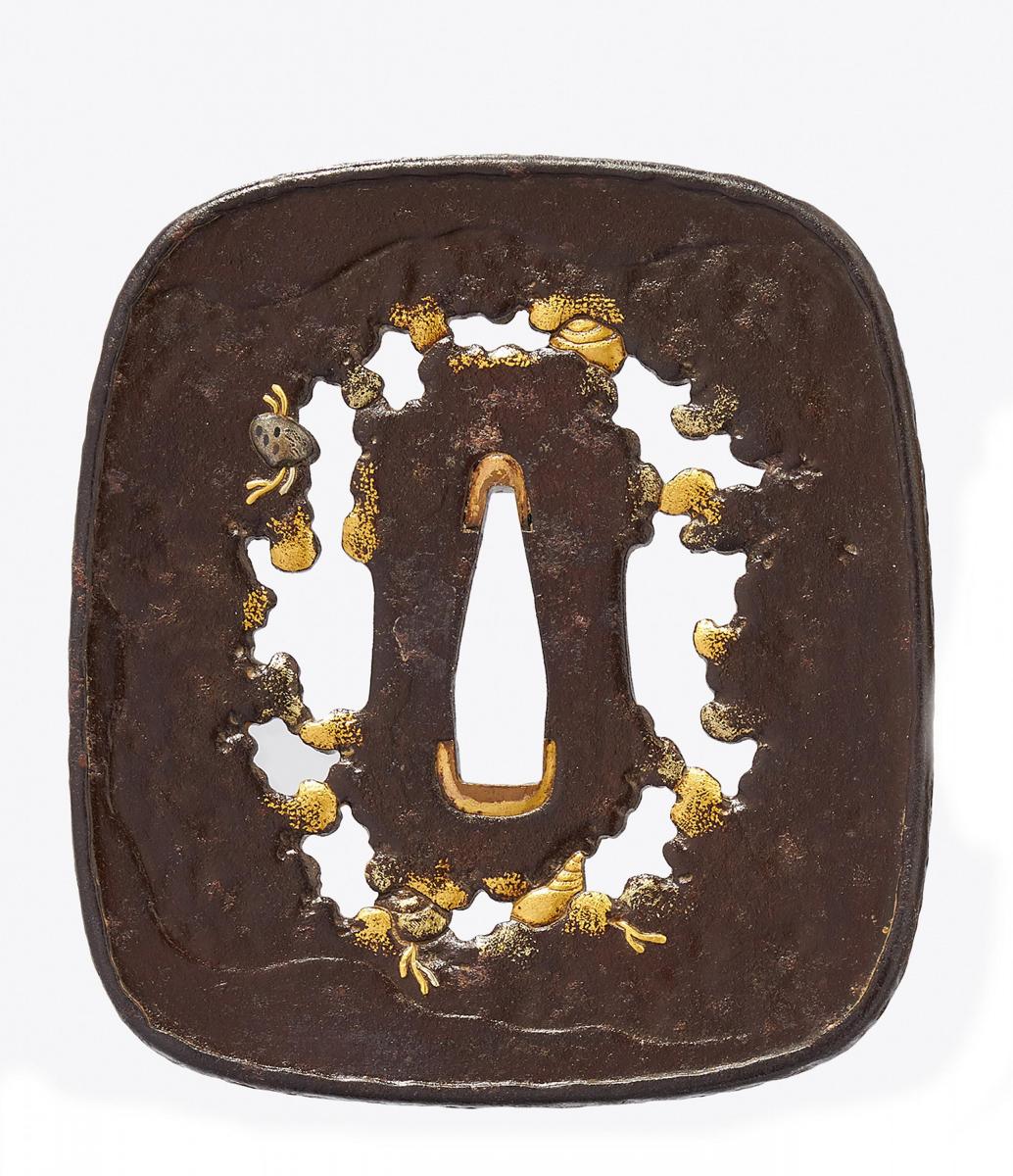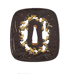 Beschreibung: Das durchbrochene Zentrum akzentuiert mit kräftigem, zweitonigem Gold-Nunome zeigt