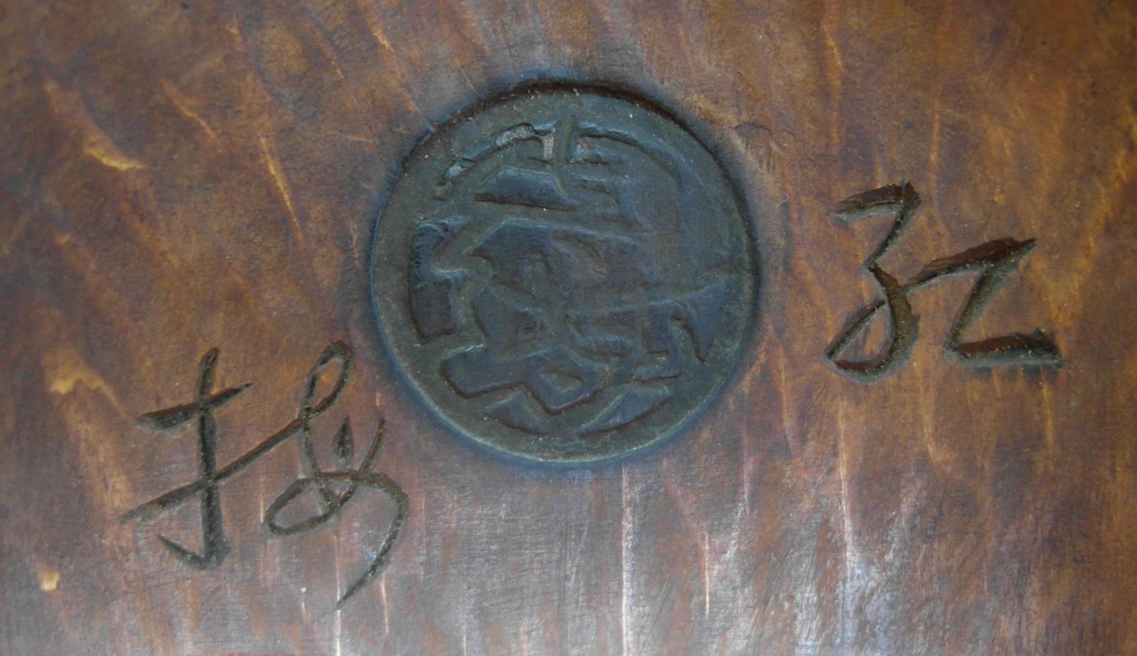 Technik: Holz, geschnitzt und bemalt. Aufbewahrungskasten und Präsentationsbrett aus Paulowniaholz (kiribako) und Seidenbeutel (shifuku).
