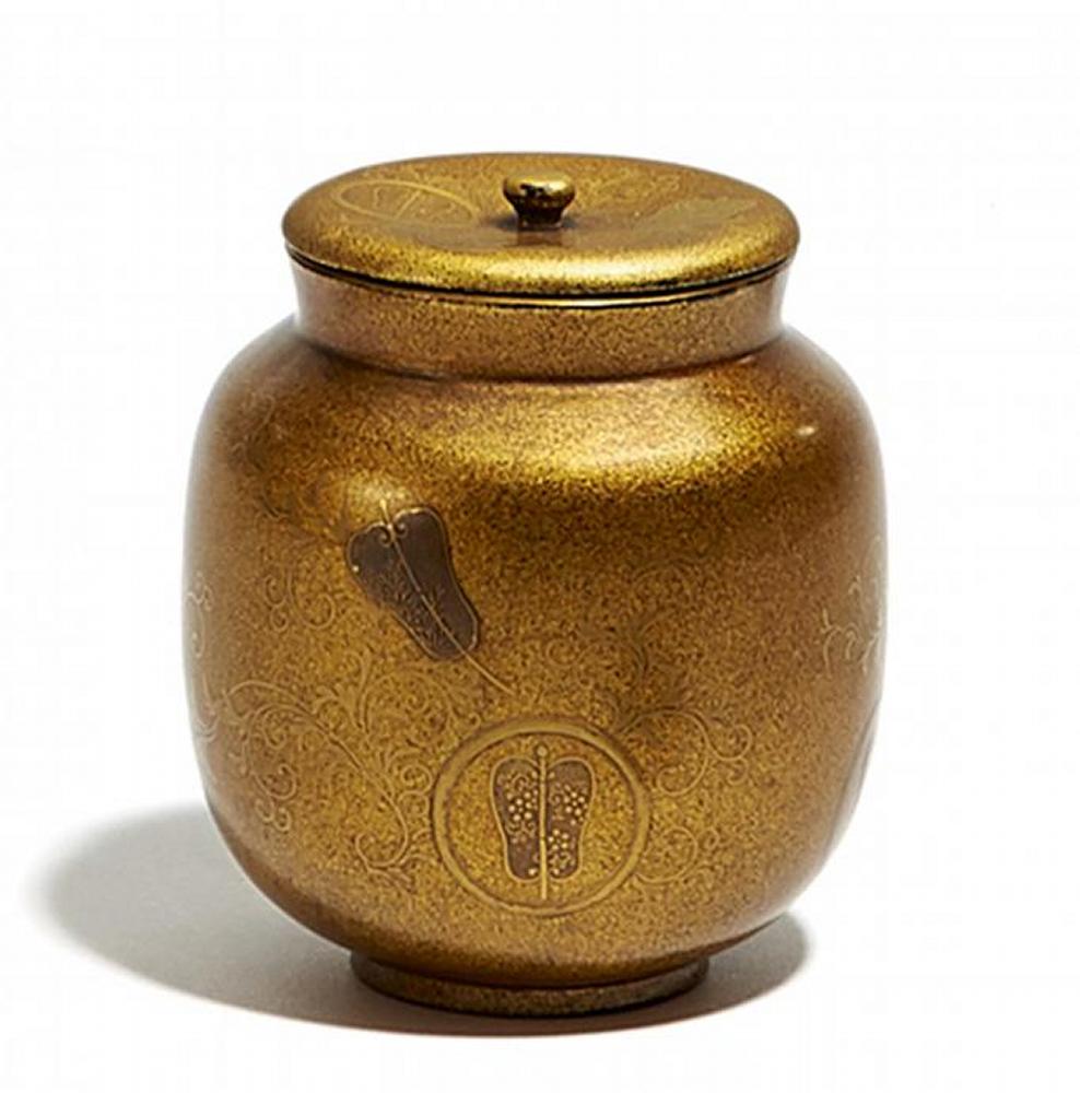 Beschreibung: In kin hiramakie Wappen mit chinesischen Fächern, diese auch zwischen karakusa-Ranken.