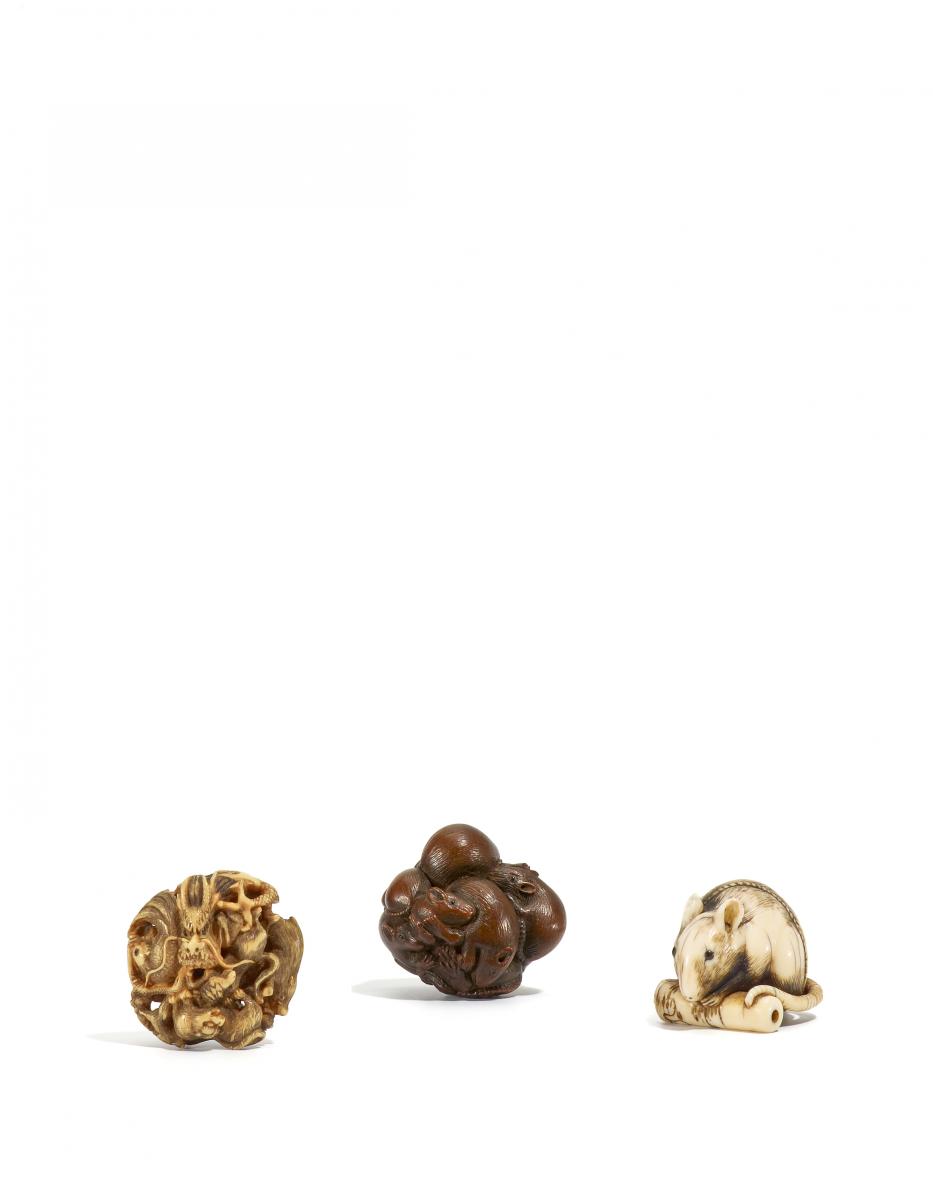Beschreibung: Gruppe aller 12 Tiere des Tierkreiszeichens, zu einer Art Manju-Form zusammen komponiert.