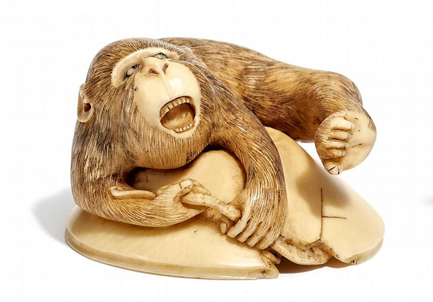 NETSUKE. AFFE AUF REIBETOPF MIT OKTOPUS. ELFENBEIN. SIGN.: MASATAMI.
