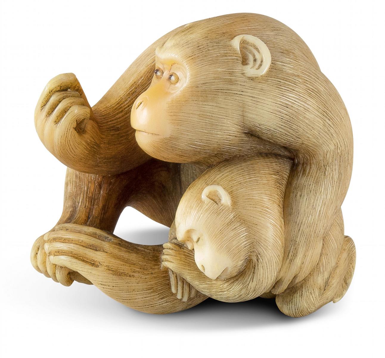 NETSUKE: AFFENPAPA MIT KIND BEIM LAUSEN.
