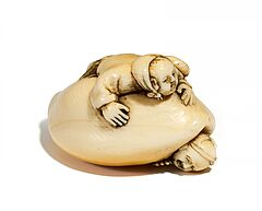 NETSUKE: BAUER AUF EINER KAURI-MUSCHEL.