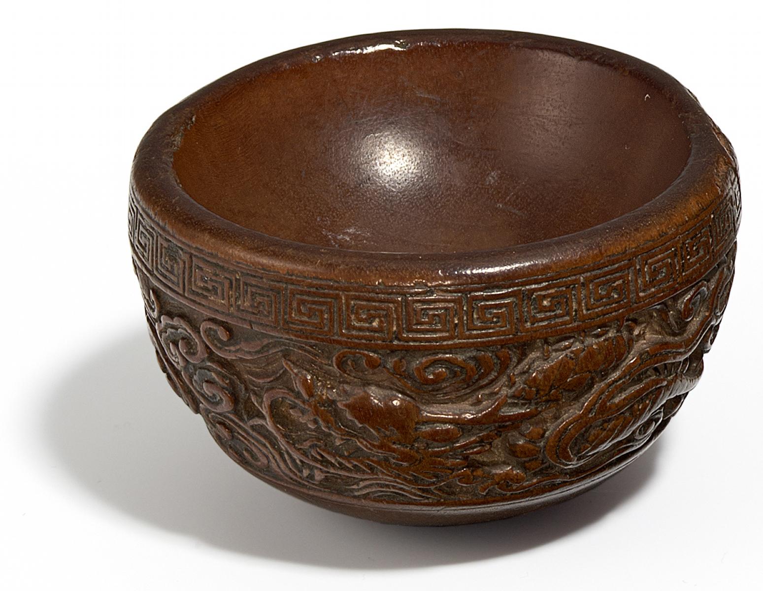 NETSUKE: BETTELSCHALE MIT DRACHEN-MOTIV.
