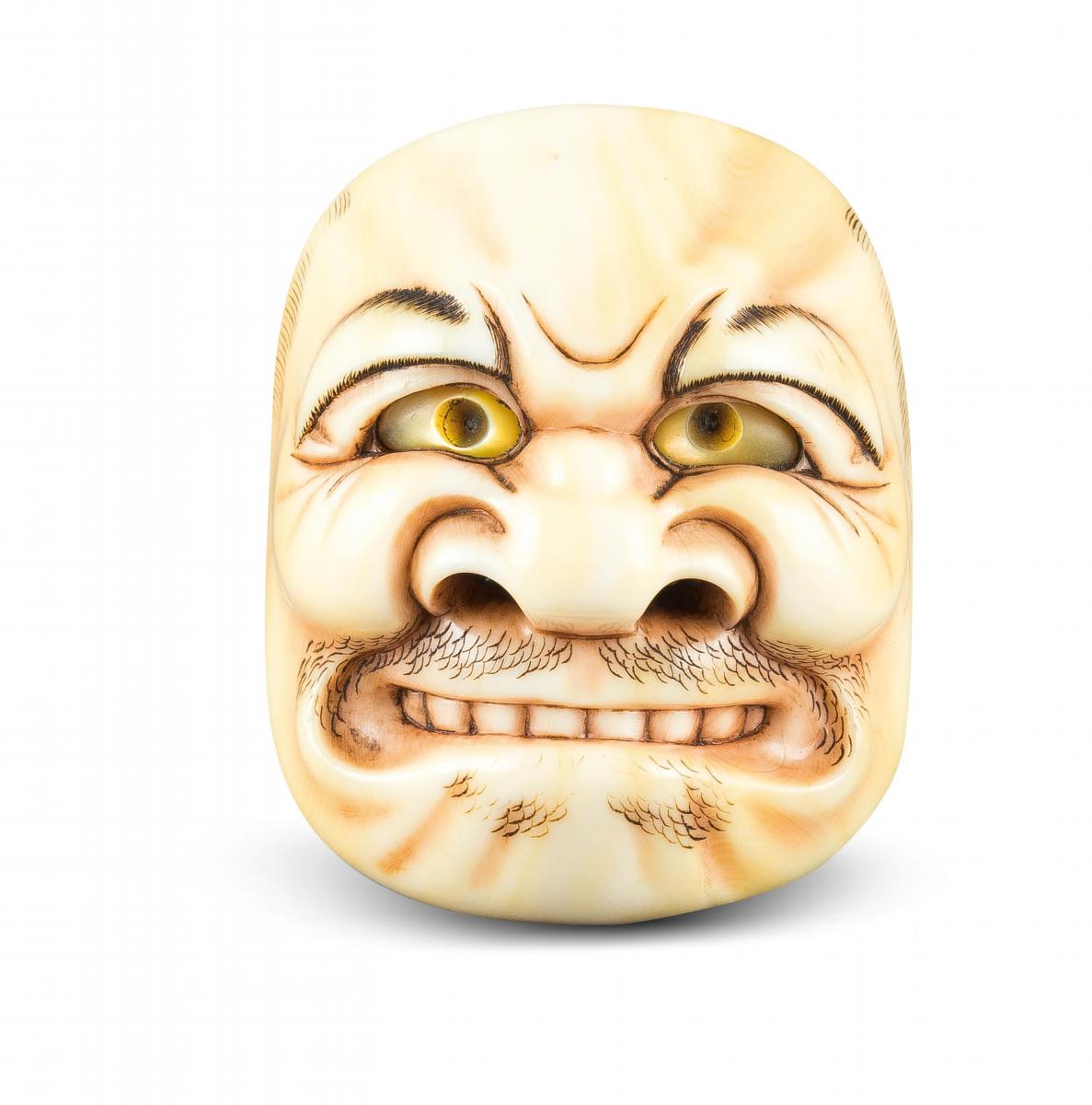 Beschreibung: Eine dämonhaft verzerrte Kyôgen-Maske mit tiefen Stirnfurchen und weit aufgeblähten