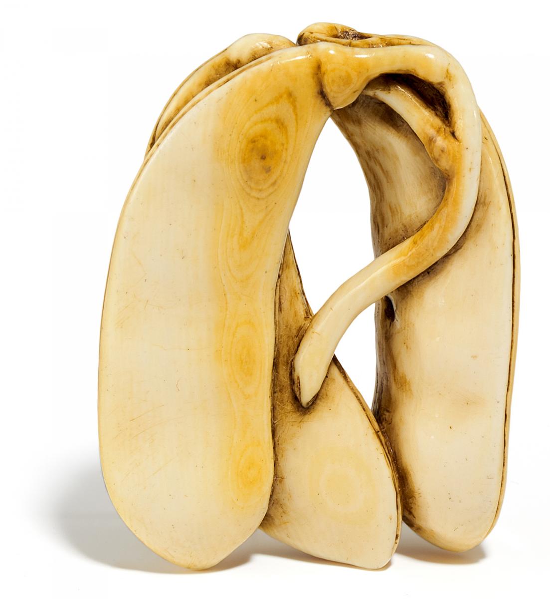 Technik: Elfenbein, fein geschnitzt und poliert, teils mit gold-gelber bis bräunlicher, natürlicher Gebrauchspatina.