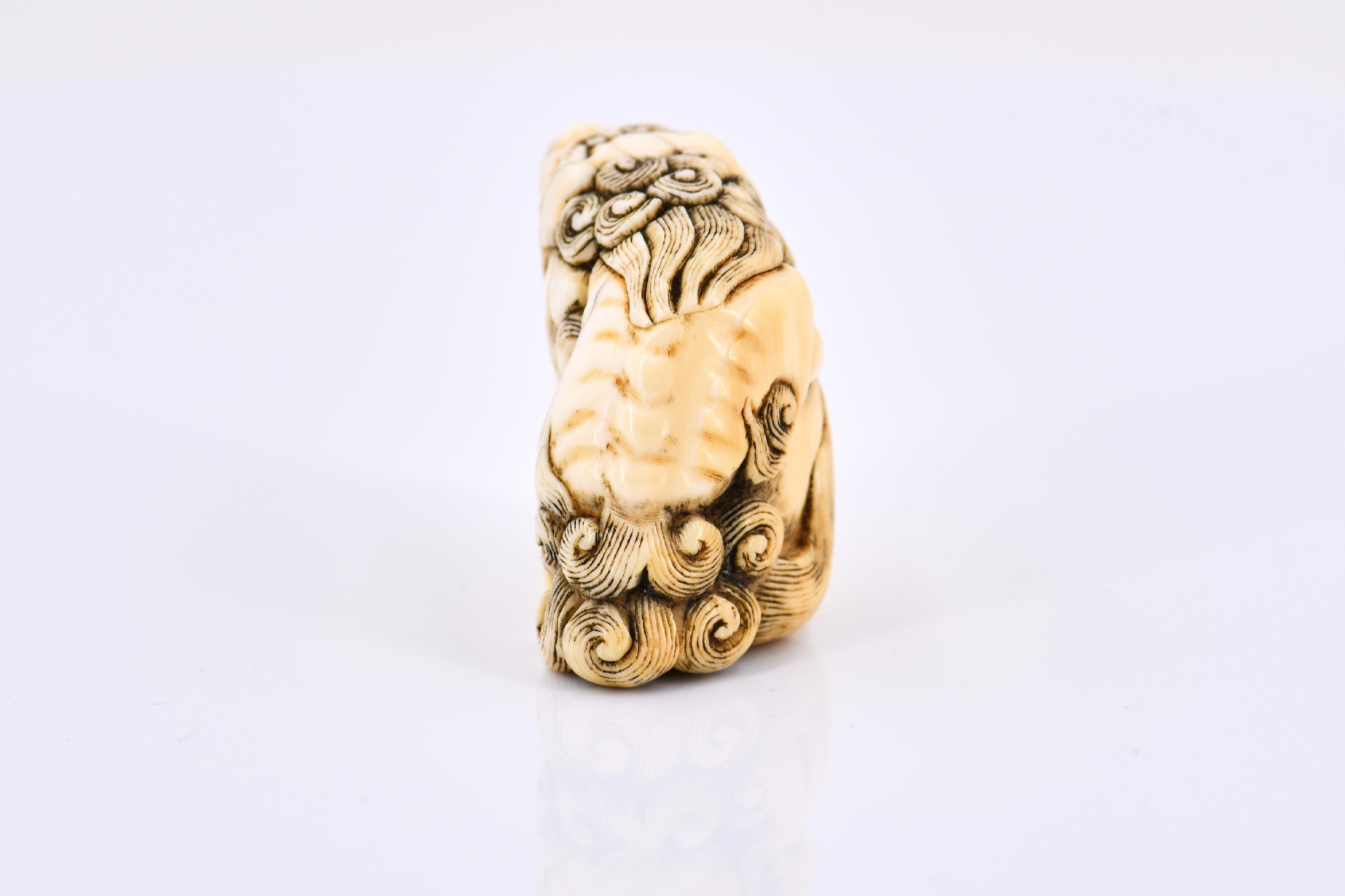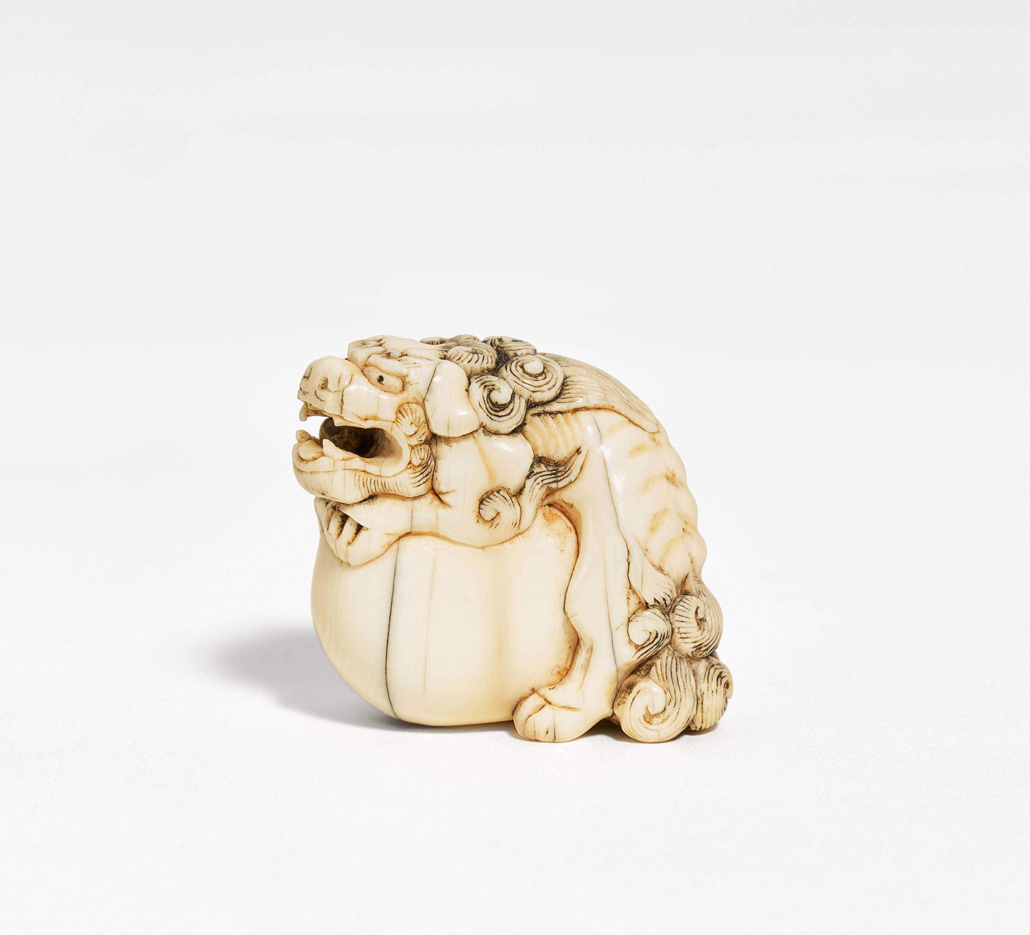 NETSUKE EINES SHISHI MIT LOSER KUGEL IM MAUL.