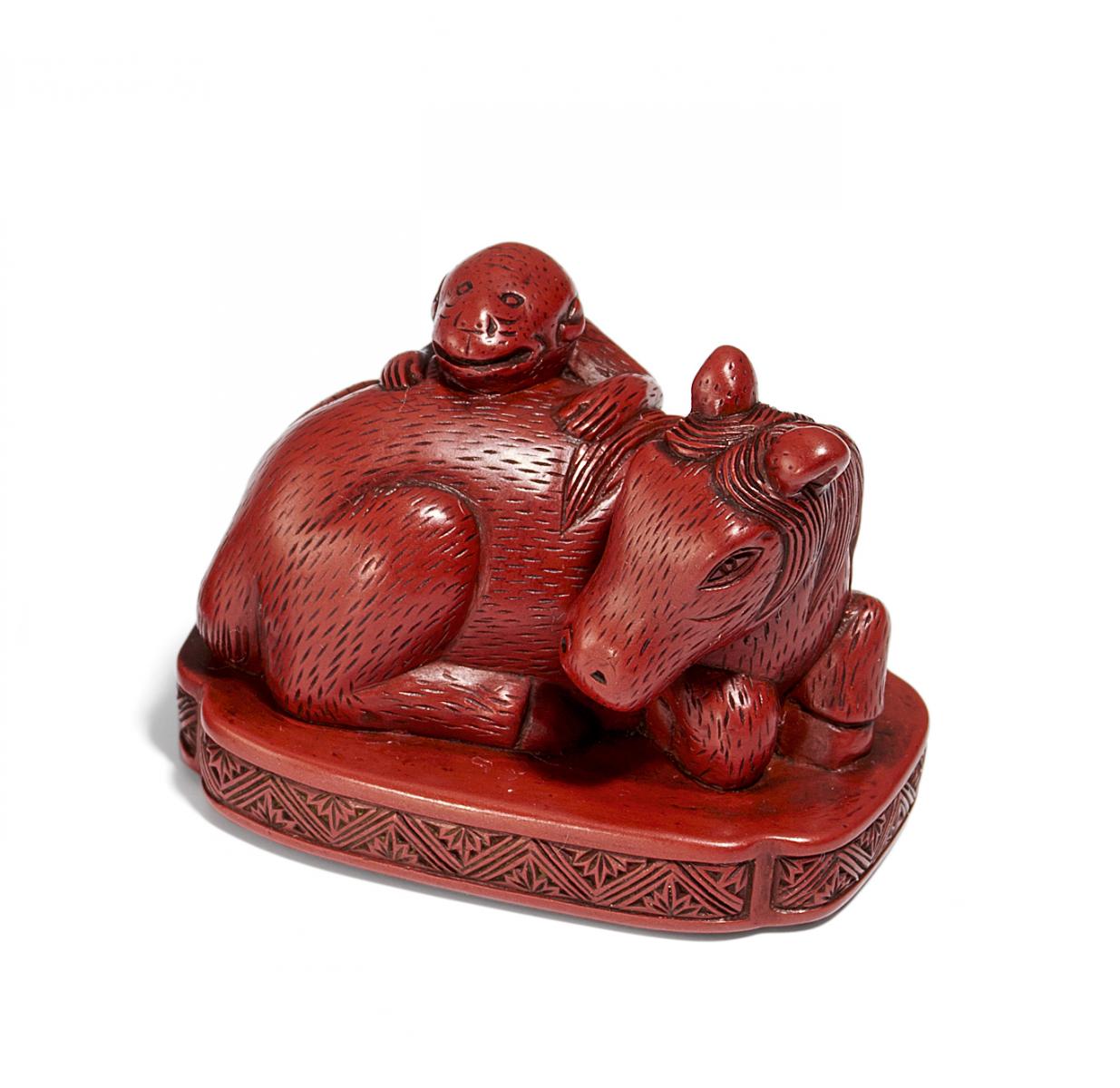 Technik: Holz, ganz bedeckt mit teils fein graviertem Tsuishu (Rotlack).
