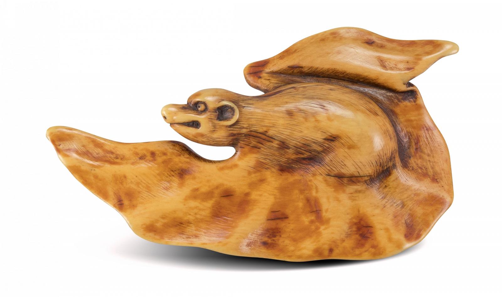 Technik: Maritimes Elfenbein, vermutlich Pottwalzahn, braun eingefärbt mit gravierten Details, dunkel akzentuiert.