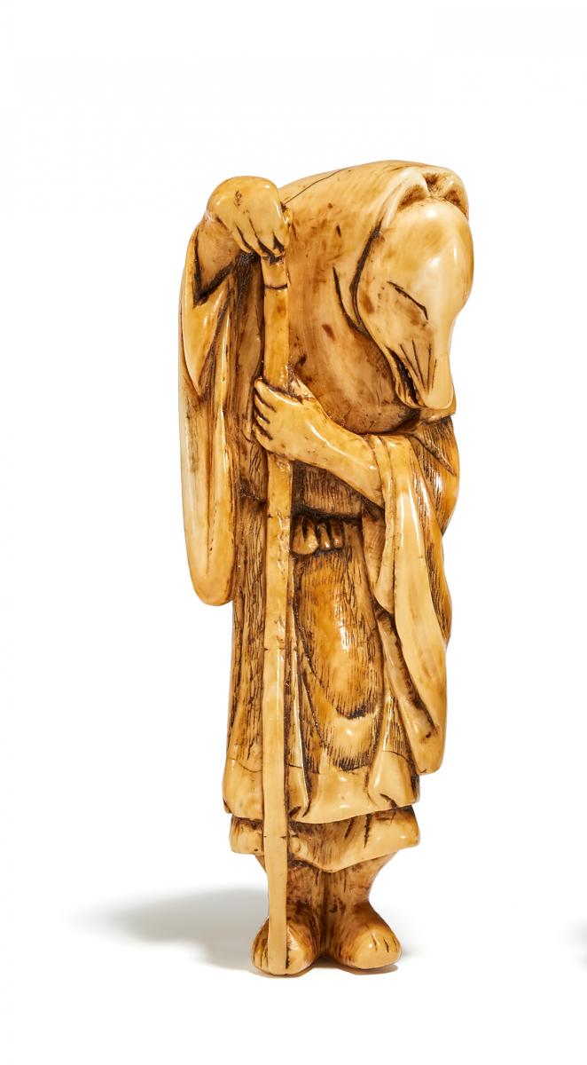 steht aufrecht mit einem langen Bambusstab in der Rechten. Schöne, bernsteinfarbene Patina.