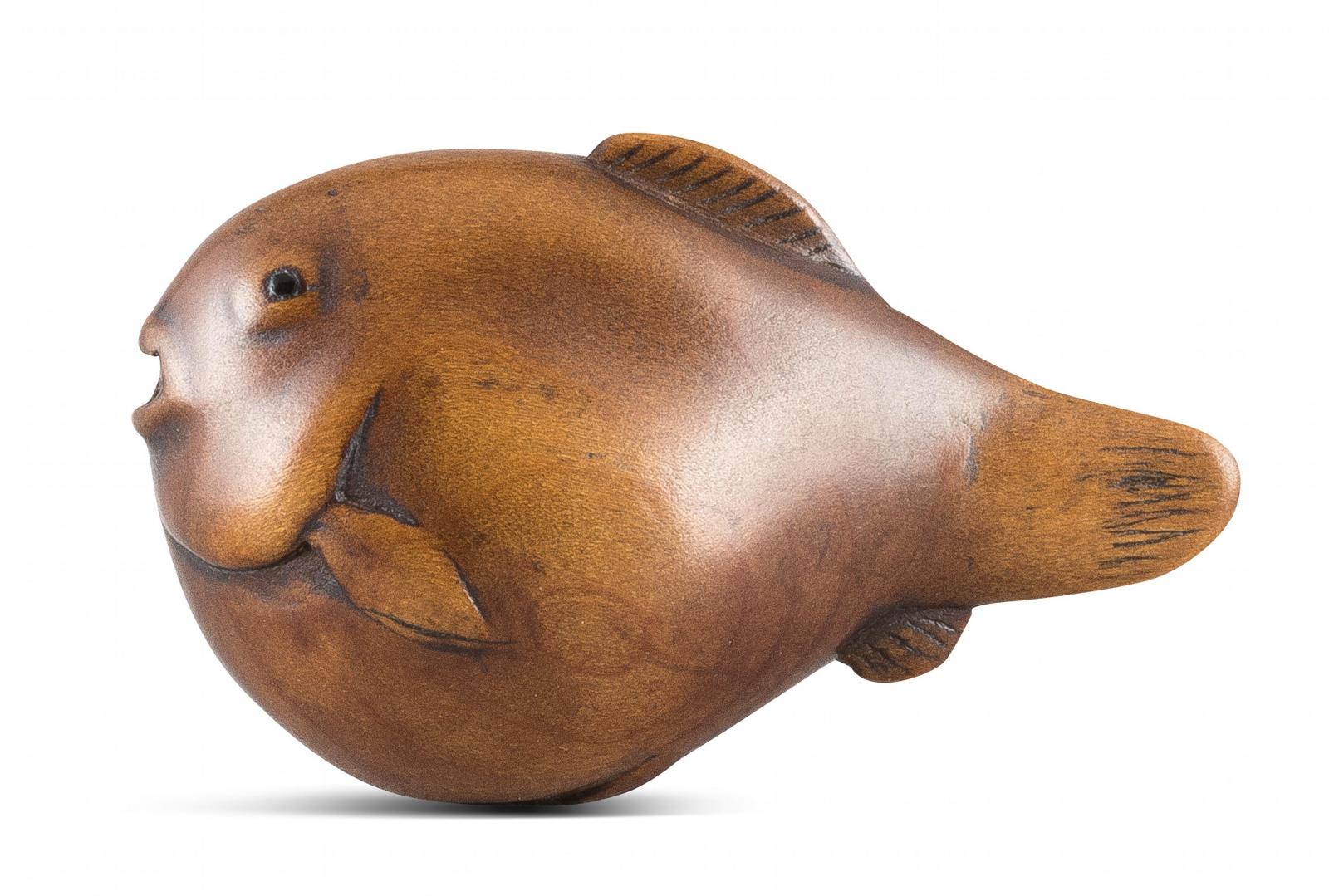 Technik: Helles Holz mit feiner Maserung, Augen eingelegt aus schwarzem Horn. Mit schöner glänzender Gebrauchspatina.