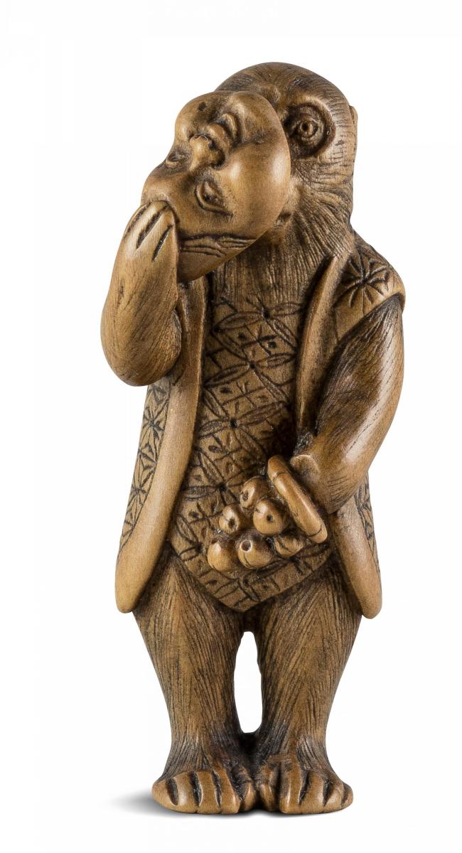 Beschreibung: Das kleine Gaukleräffchen mit der umgedrehten Maske der Okame in der einen, einen