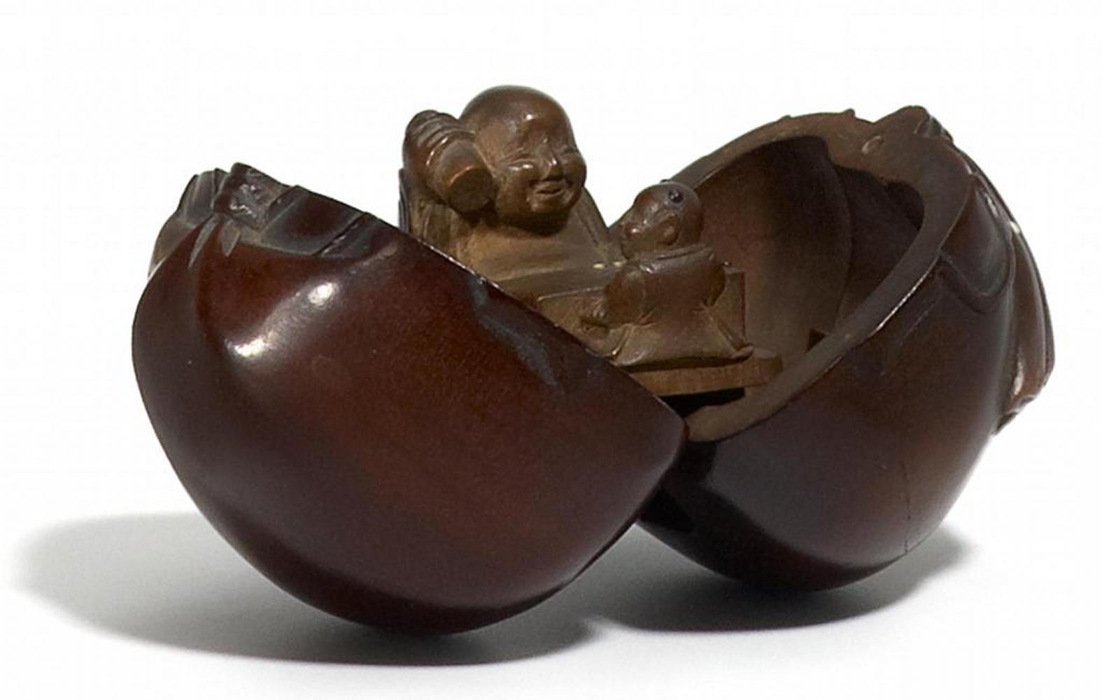 NETSUKE: GLÜCKSBEUTEL DES HOTEI, OBSTHOLZ.