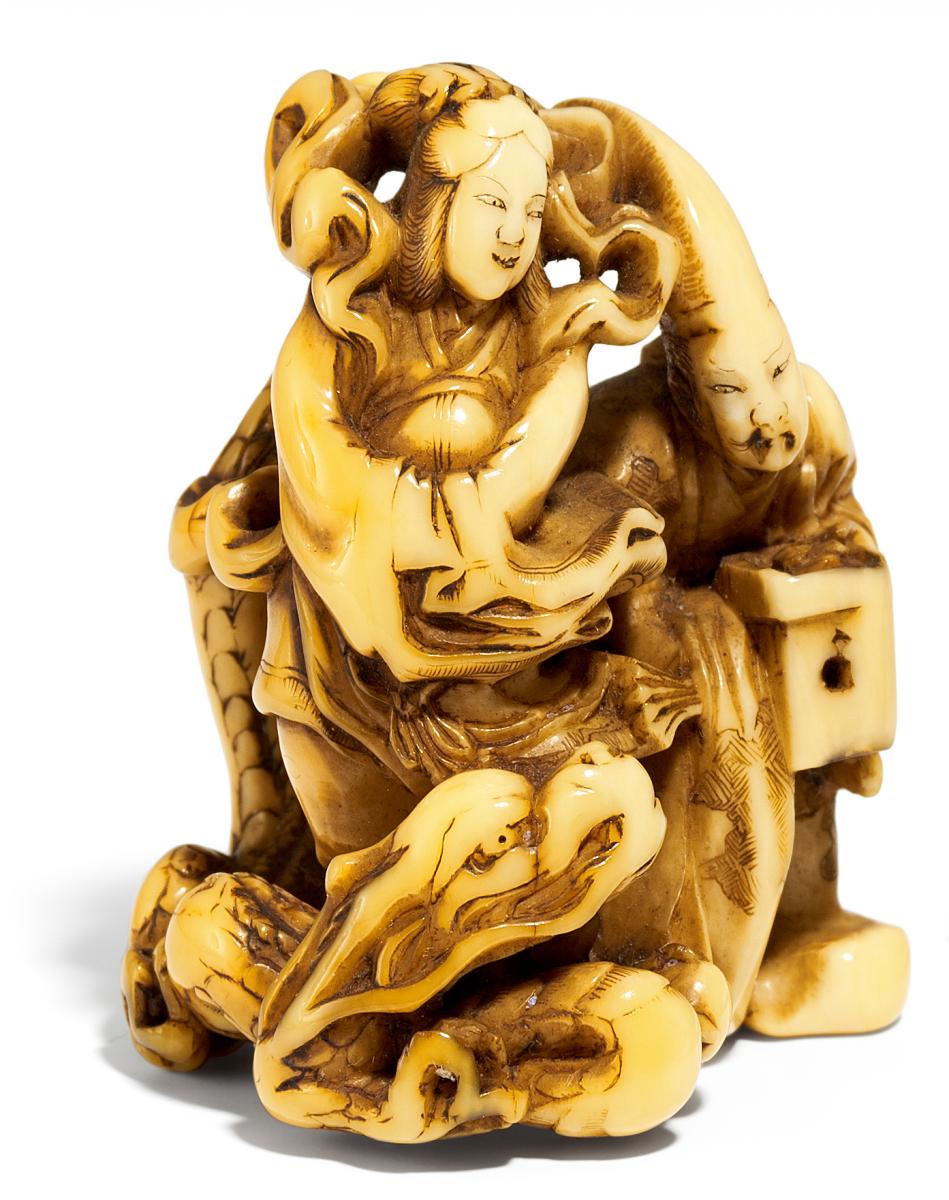 NETSUKE: GLÜCKSGÖTTIN BENTEN MIT HÔJÔ TOKIMASA.