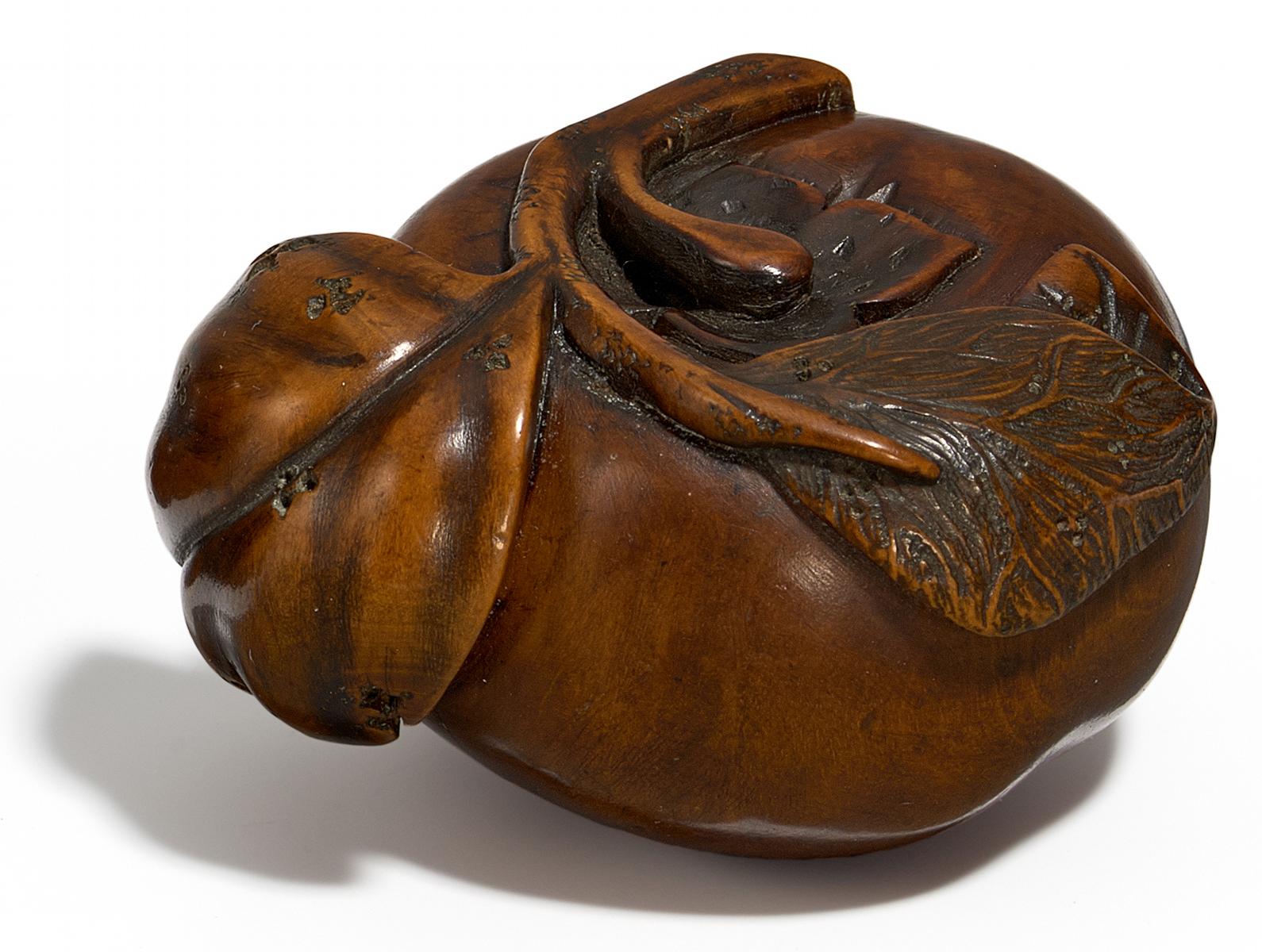 Beschreibung: Große Kakifrucht an Zweig mit teils kräftigen Blättern.
