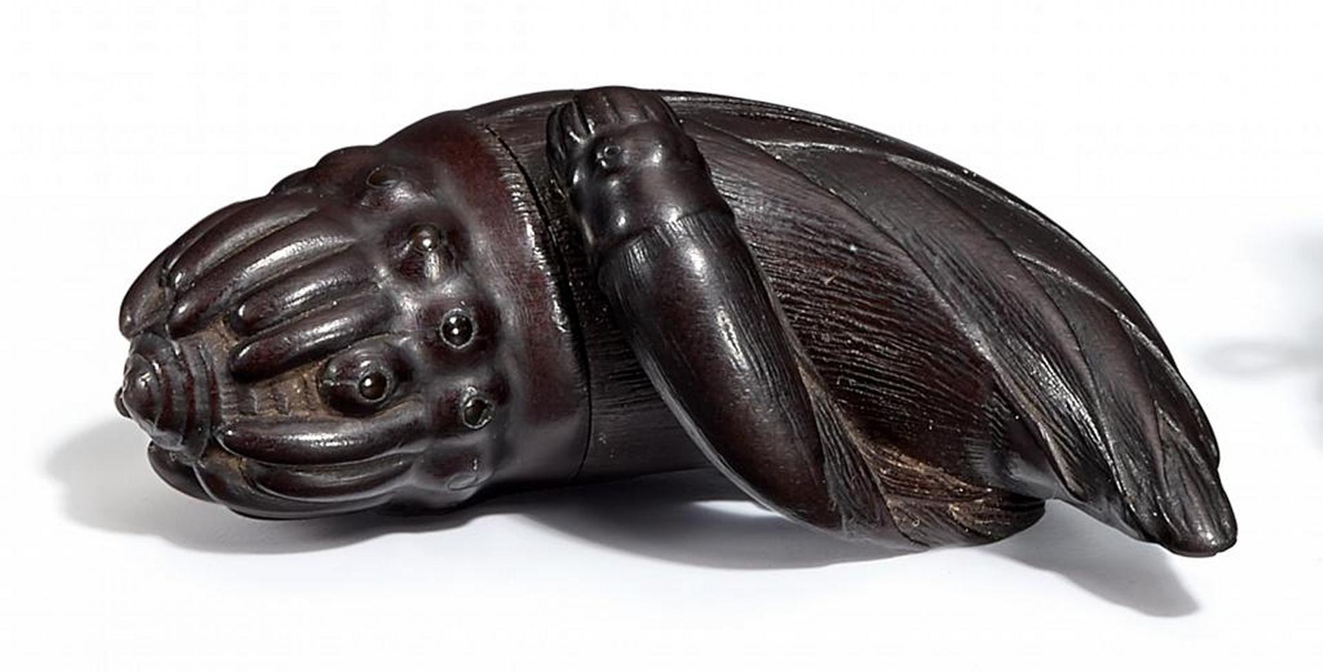 NETSUKE. GROßE UND KLEINE BAMBUSSPROSSE, KAGUYAHIME. OBSTHOLZ.