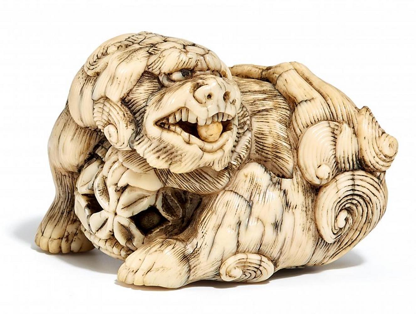 beweglichen Ball. Fein geschnitzt und graviert, die Augen eingelegt aus schwarzem Horn.