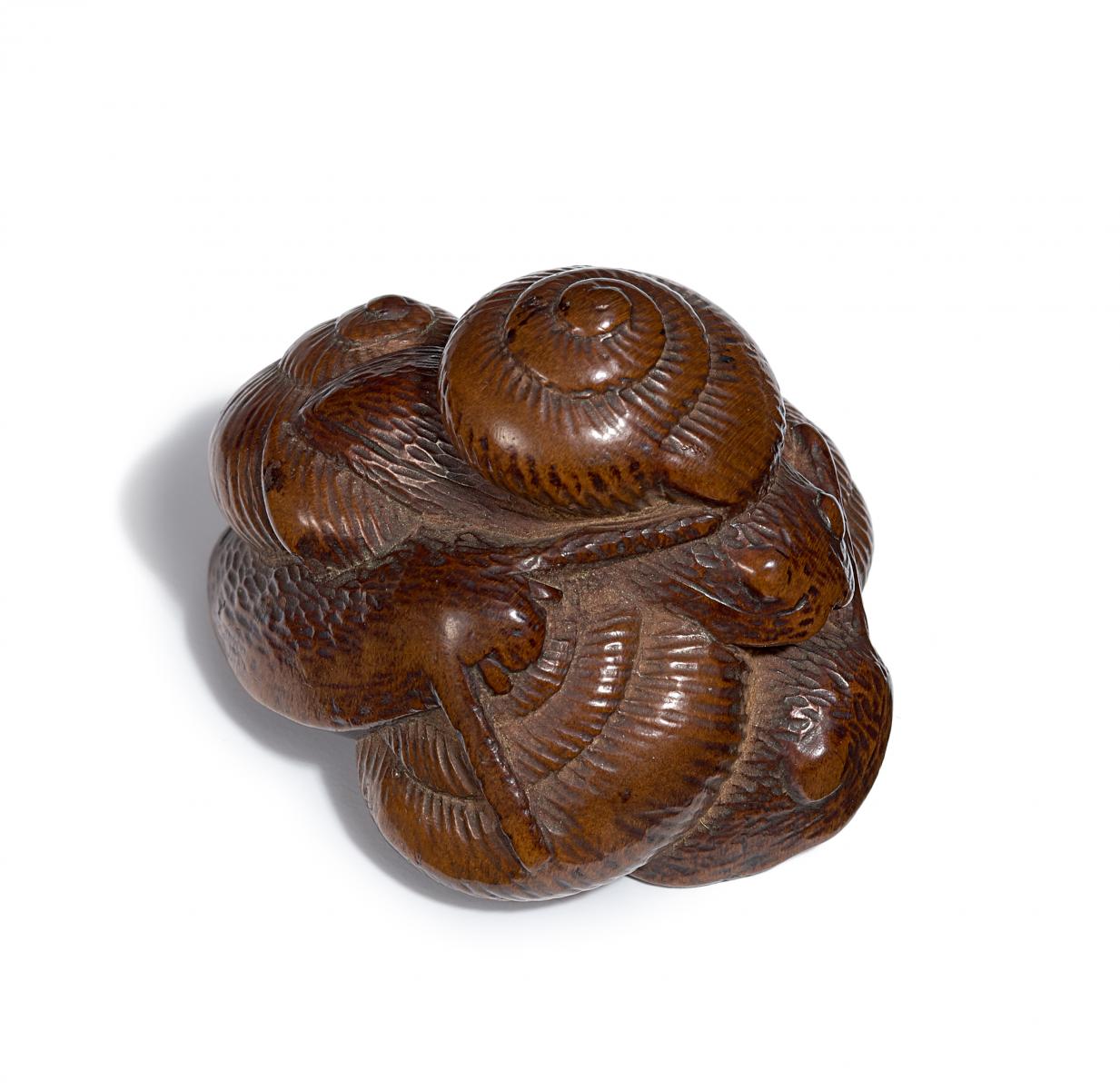 Beschreibung: Gruppe von vier übereinander kriechenden Schnecken. Fein geschnitzt und graviert, schöne