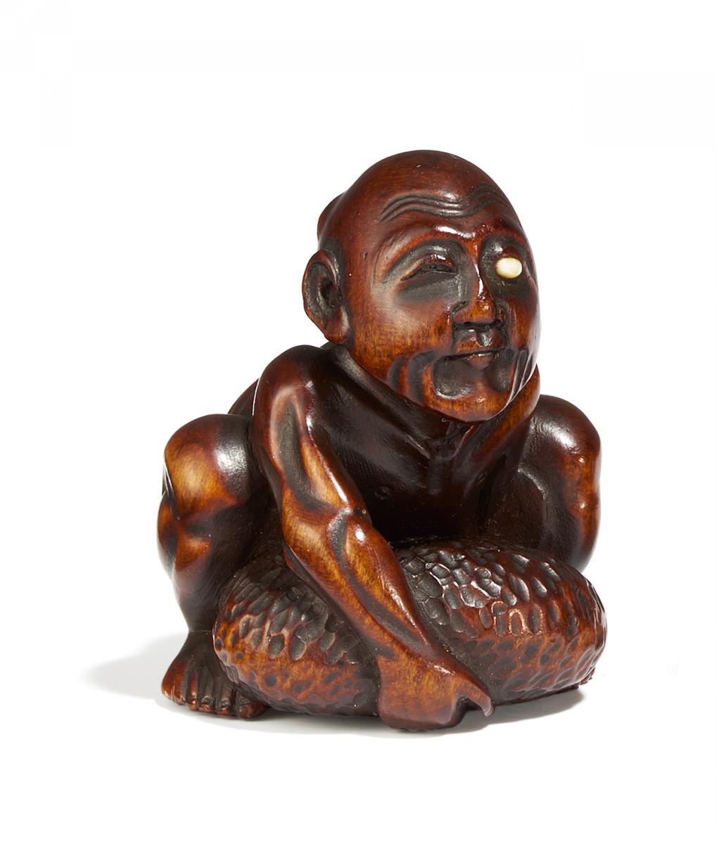 Technik: Buchsbaum mit fein geschnitzten und gravierten Details, schöne, glänzende Patina. Das linke Auge eingelegt aus Bein.