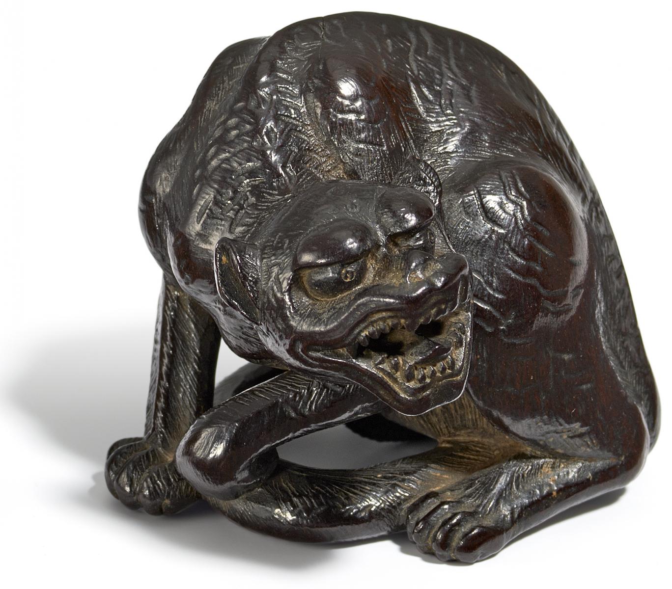 Technik: Schwarzes Kakiholz, sehr bewegt und expressiv geschnitzt, die Fell-Streifen kräftig graviert.