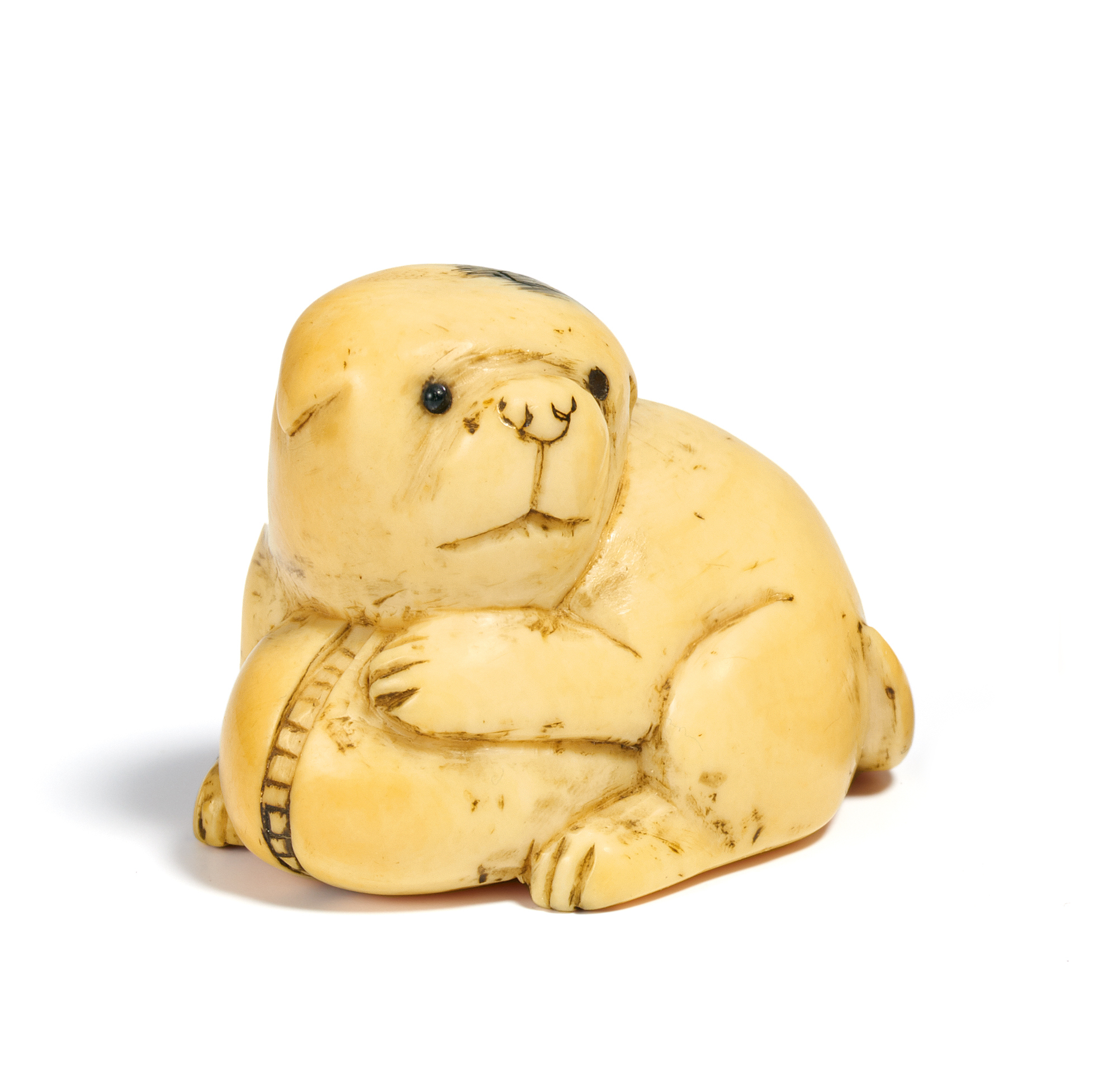 NETSUKE: HÜNDCHEN MIT KEMARI-BALL.
