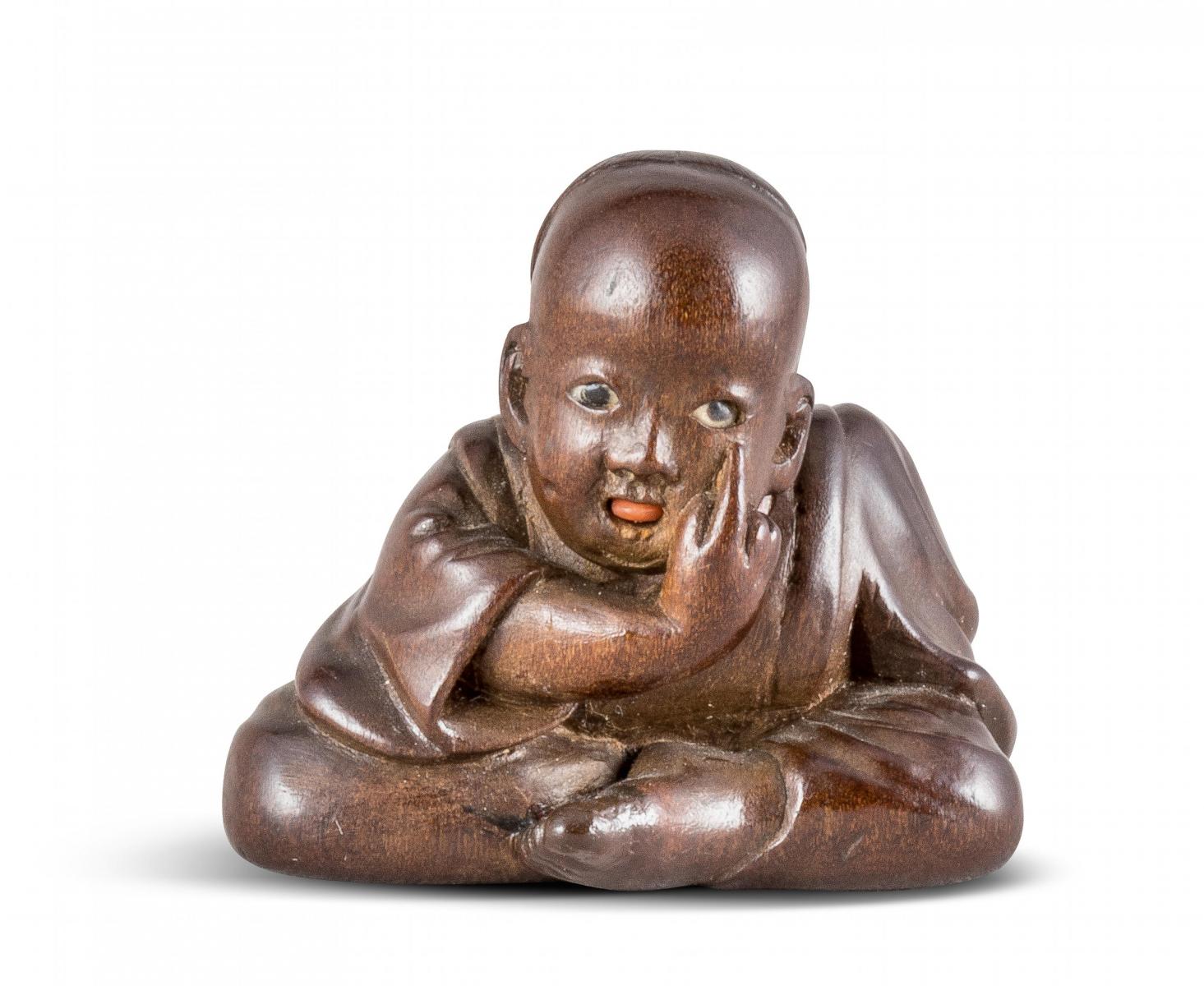 Technik: Dichtmaseriges, dunkelbraunes Holz, fein geschnitzt und graviert, die hintermalten Augen eingesetzt aus Glas, die Zunge aus roter Koralle.