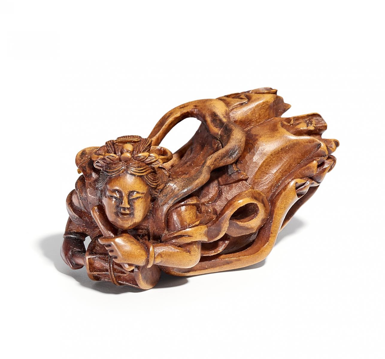 NETSUKE. KARYÔBINGA MIT DIADEM UND BÄNDERN. BUCHSBAUM. SIGN.: MINKOKU.